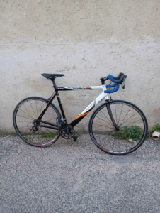 vélo entièrement monté avec pièces d’un vélo de course carbone dont le cadre était fissuré…et donc bon pour la poubelle 🙁